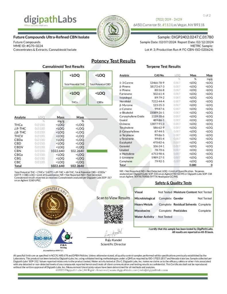 Vores CBN Isolat – 98% renhed er et hvidt pulver udvundet af EU-godkendt industrihamp. Produktet er helt fri for THC (<0,05%) og leveres i laboratorietestet premiumkvalitet.